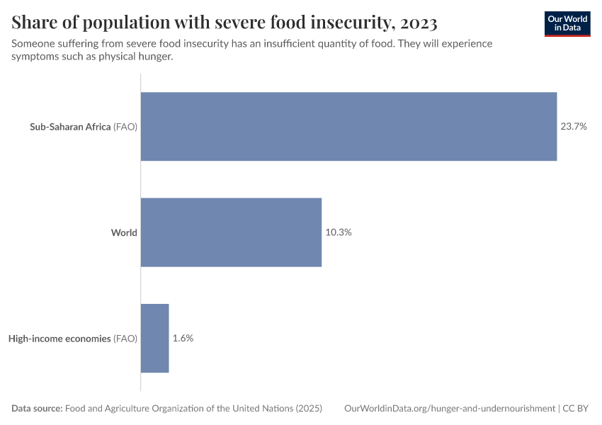 “Data Page: Prevalence of severe food insecurity in the total population”, part of the following publication: Hannah Ritchie, Pablo Rosado, and Max Roser (2023) - “Agricultural Production”. Data adapted from Food and Agriculture Organization of the United Nations. Retrieved from https://categorical-map-color.owid.pages.dev/grapher/share-of-population-with-severe-food-insecurity [online resource]How to cite this data