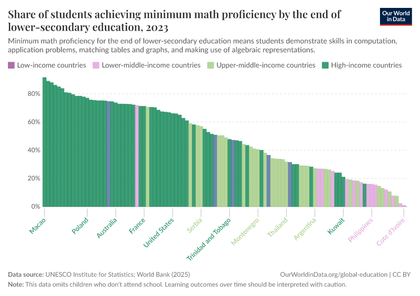 “Data Page: Share of students achieving minimum math proficiency by the end of lower-secondary education”. Our World in Data (2026). Data adapted from UNESCO Institute for Statistics. Retrieved from https://categorical-map-color.owid.pages.dev/grapher/share-of-students-at-end-of-lower-secondary-education-achieving-minimum-math-proficiency [online resource]How to cite this data