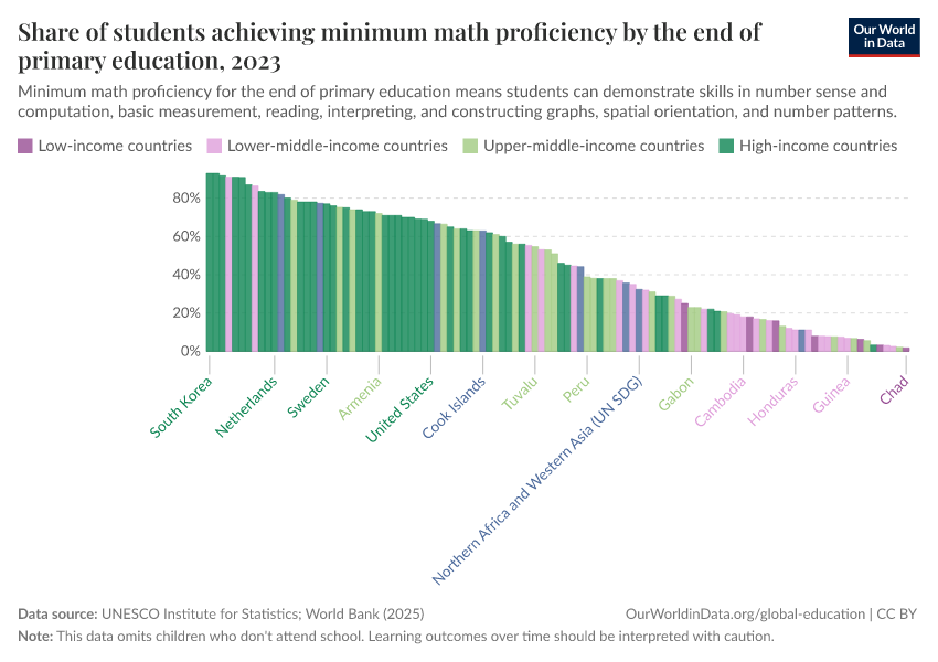 “Data Page: Share of students achieving minimum math proficiency by the end of primary education”. Our World in Data (2026). Data adapted from UNESCO Institute for Statistics. Retrieved from https://categorical-map-color.owid.pages.dev/grapher/share-of-students-at-end-of-primary-education-achieving-minimum-math-proficiency [online resource]How to cite this data
