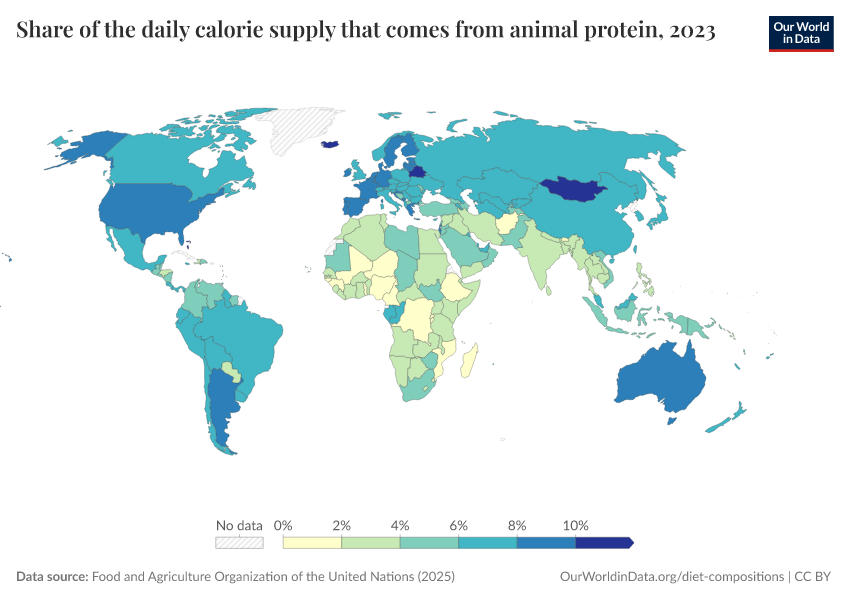 “Data Page: Share of the daily calorie supply that comes from animal protein”, part of the following publication: Hannah Ritchie, Pablo Rosado, and Max Roser (2023) - “Agricultural Production”. Data adapted from Food and Agriculture Organization of the United Nations. Retrieved from https://categorical-map-color.owid.pages.dev/grapher/share-of-the-daily-calorie-supply-that-comes-from-animal-protein [online resource]How to cite this data