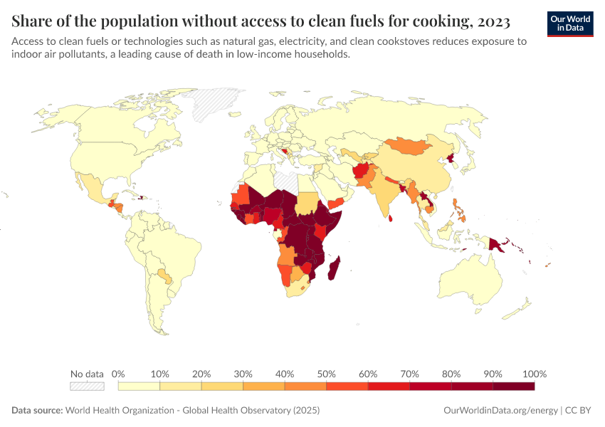 World Health Organization - Global Health Observatory (2025) – processed by Our World in Data. “Share of the population without access to clean fuels for cooking” [dataset]. World Health Organization, “Global Health Observatory” [original data]. Retrieved February 24, 2026 from https://categorical-map-color.owid.pages.dev/grapher/share-of-the-population-without-access-to-clean-fuels-for-cooking