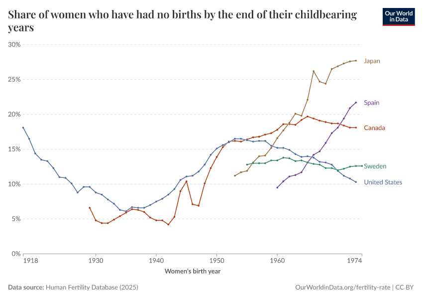 “Data Page: Share of women who have had no births by the end of their childbearing years”, part of the following publication: Saloni Dattani, Lucas Rodés-Guirao, and Max Roser (2025) - “Fertility Rate”. Data adapted from Human Fertility Database. Retrieved from https://categorical-map-color.owid.pages.dev/grapher/share-of-women-who-have-had-no-births-across-their-childbearing-years [online resource]How to cite this data