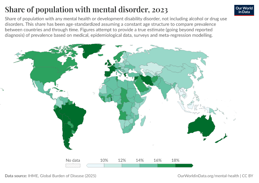 “Data Page: Share of population with mental disorder”, part of the following publication: Saloni Dattani, Lucas Rodés-Guirao, Hannah Ritchie, and Max Roser (2023) - “Mental Health”. Data adapted from IHME, Global Burden of Disease. Retrieved from https://categorical-map-color.owid.pages.dev/grapher/share-with-mental-health-or-development-disorder [online resource]How to cite this data