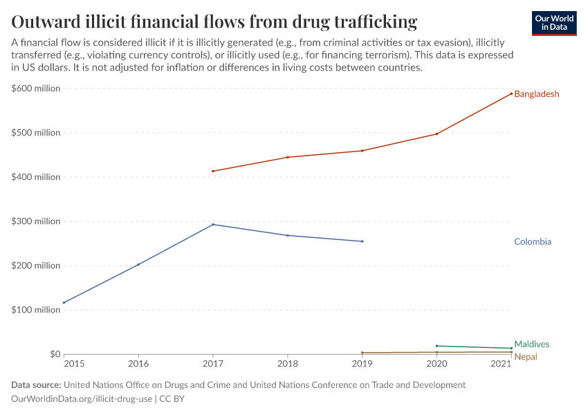 “Data Page: Outward illicit financial flows from drug trafficking”. Our World in Data (2026). Data adapted from United Nations Office on Drugs and Crime and United Nations Conference on Trade and Development. Retrieved from https://categorical-map-color.owid.pages.dev/grapher/total-outward-financial-flows-from-drug-trafficking [online resource]How to cite this data