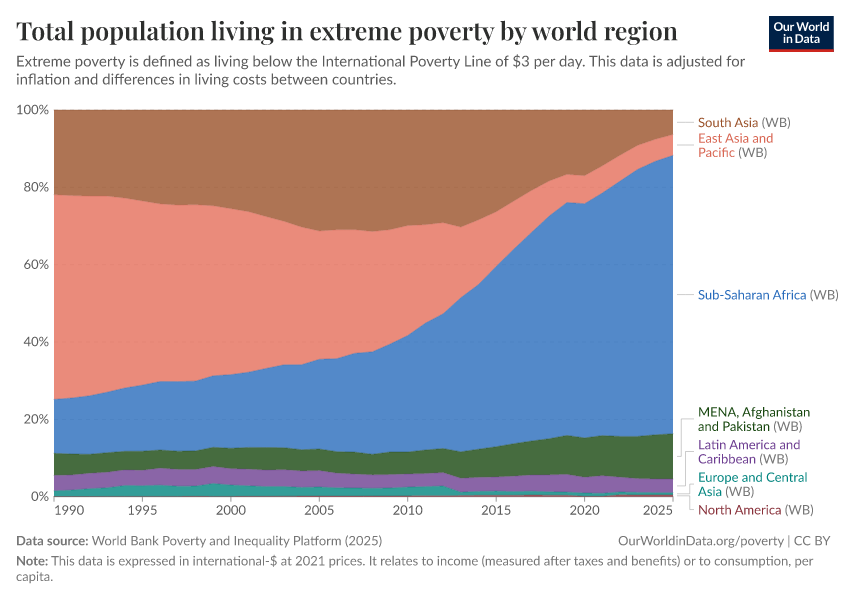 World Bank Poverty and Inequality Platform (2025) – with major processing by Our World in Data. “Total population living in extreme poverty by world region – World Bank” [dataset]. World Bank Poverty and Inequality Platform, “World Bank Poverty and Inequality Platform (PIP) 20250930_2021, 20250930_2017” [original data]. Retrieved February 24, 2026 from https://categorical-map-color.owid.pages.dev/grapher/total-population-living-in-extreme-poverty-by-world-region