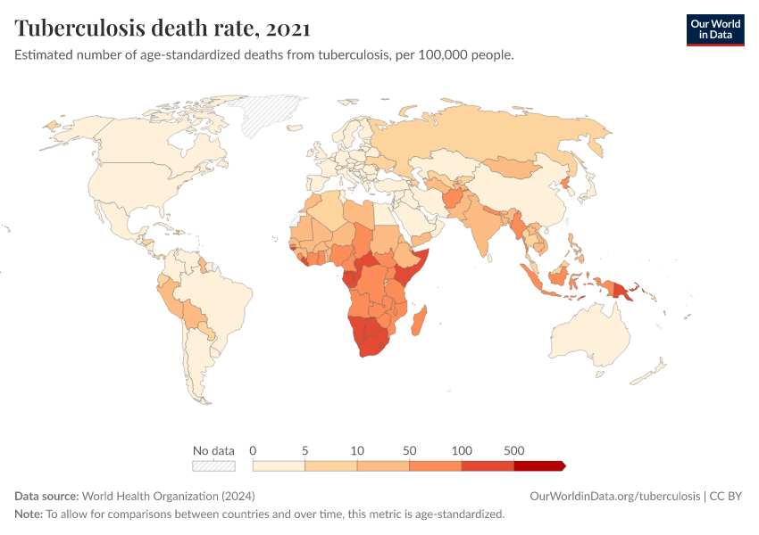 “Data Page: Tuberculosis death rate”, part of the following publication: Esteban Ortiz-Ospina and Max Roser (2016) - “Global Health”. Data adapted from World Health Organization. Retrieved from https://categorical-map-color.owid.pages.dev/grapher/tuberculosis-death-rate-age-standardized [online resource]How to cite this data