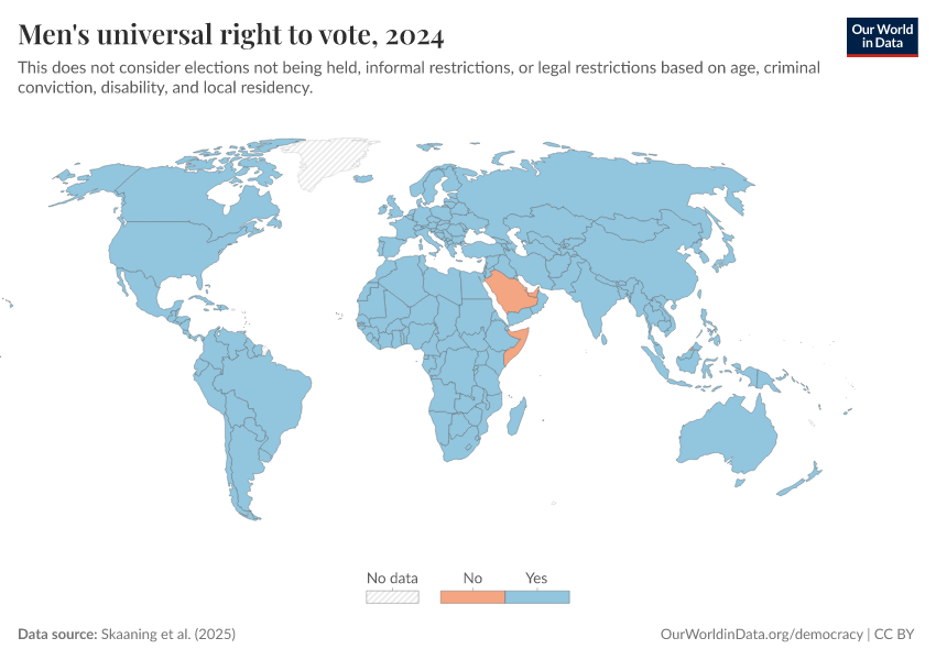 “Data Page: Men's universal right to vote”, part of the following publication: Bastian Herre, Lucas Rodés-Guirao, and Esteban Ortiz-Ospina (2013) - “Democracy”. Data adapted from Skaaning et al.. Retrieved from https://categorical-map-color.owid.pages.dev/grapher/universal-suffrage-men-lexical [online resource]How to cite this data
