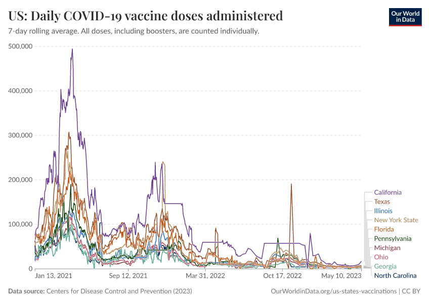 “Data Page: US: Daily COVID-19 vaccine doses administered”, part of the following publication: Edouard Mathieu, Hannah Ritchie, Lucas Rodés-Guirao, Cameron Appel, Daniel Gavrilov, Charlie Giattino, Joe Hasell, Bobbie Macdonald, Saloni Dattani, Diana Beltekian, Esteban Ortiz-Ospina, and Max Roser (2020) - “COVID-19 Pandemic”. Data adapted from Centers for Disease Control and Prevention. Retrieved from https://categorical-map-color.owid.pages.dev/grapher/us-daily-covid-vaccine-doses-administered [online resource]How to cite this data