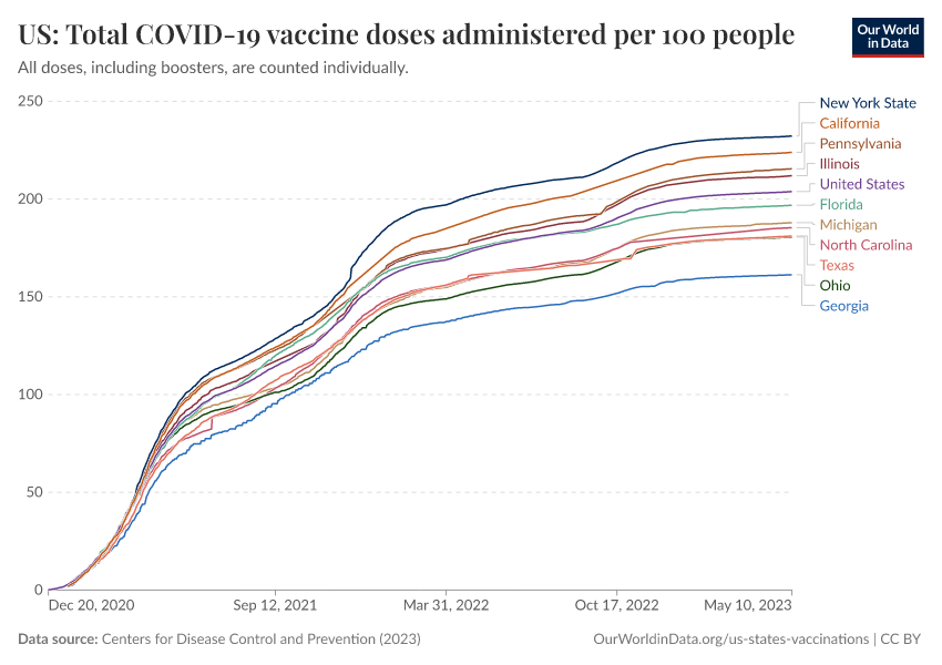 “Data Page: US: Total COVID-19 vaccine doses administered per 100 people”, part of the following publication: Edouard Mathieu, Hannah Ritchie, Lucas Rodés-Guirao, Cameron Appel, Daniel Gavrilov, Charlie Giattino, Joe Hasell, Bobbie Macdonald, Saloni Dattani, Diana Beltekian, Esteban Ortiz-Ospina, and Max Roser (2020) - “COVID-19 Pandemic”. Data adapted from Centers for Disease Control and Prevention. Retrieved from https://categorical-map-color.owid.pages.dev/grapher/us-state-covid-vaccines-per-100 [online resource]How to cite this data