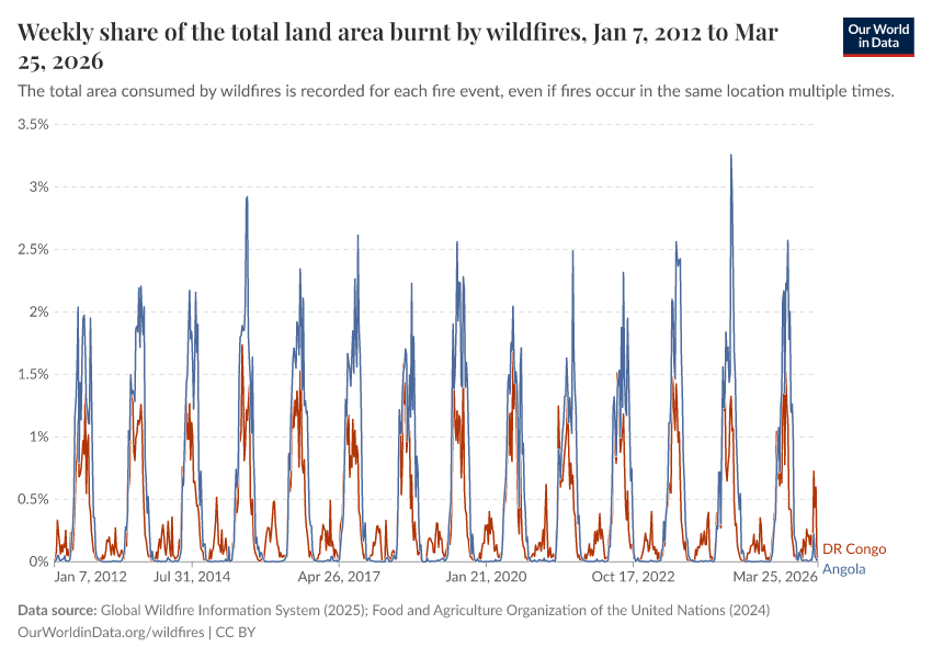 Global Wildfire Information System (2026); Global Wildfire Information System (2024); Food and Agriculture Organization of the United Nations (2024) – with minor processing by Our World in Data. “Weekly share of the total land area burnt by wildfires” [dataset]. Global Wildfire Information System, “Seasonal wildfire trends”; Food and Agriculture Organization of the United Nations, “Land, Inputs and Sustainability: Land Use” [original data]. Retrieved February 24, 2026 from https://categorical-map-color.owid.pages.dev/grapher/weekly-share-of-the-total-land-area-burnt-by-wildfires