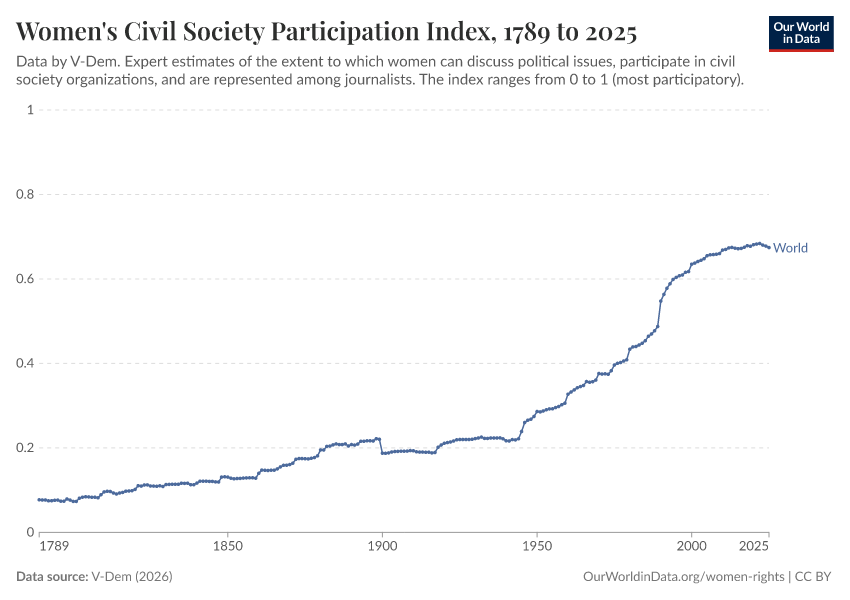 “Data Page: Women's civil society participation index”, part of the following publication: Bastian Herre, Lucas Rodés-Guirao, and Esteban Ortiz-Ospina (2013) - “Democracy”. Data adapted from V-Dem. Retrieved from https://categorical-map-color.owid.pages.dev/grapher/women-civil-society-participation-index [online resource]
