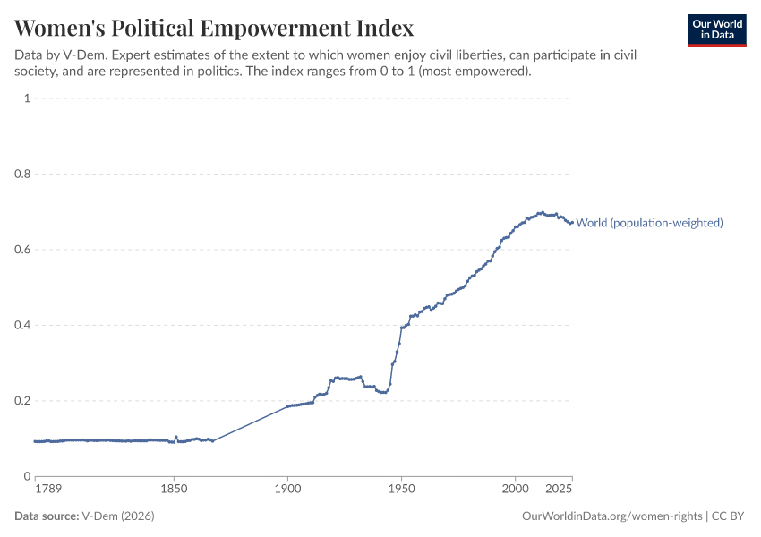“Data Page: Women's political empowerment index”, part of the following publication: Bastian Herre, Lucas Rodés-Guirao, and Esteban Ortiz-Ospina (2013) - “Democracy”. Data adapted from V-Dem. Retrieved from https://categorical-map-color.owid.pages.dev/grapher/women-political-empowerment-index [online resource]How to cite this data