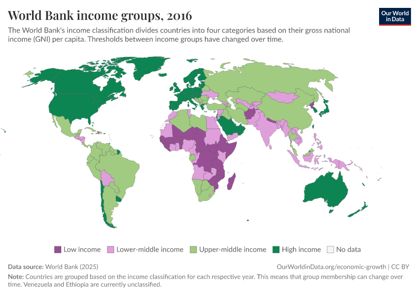 “Data Page: World Bank income groups”, part of the following publication: Max Roser, Bertha Rohenkohl, Pablo Arriagada, Joe Hasell, Hannah Ritchie, and Esteban Ortiz-Ospina (2023) - “Economic Growth”. Data adapted from World Bank. Retrieved from https://categorical-map-color.owid.pages.dev/grapher/world-bank-income-groups [online resource]