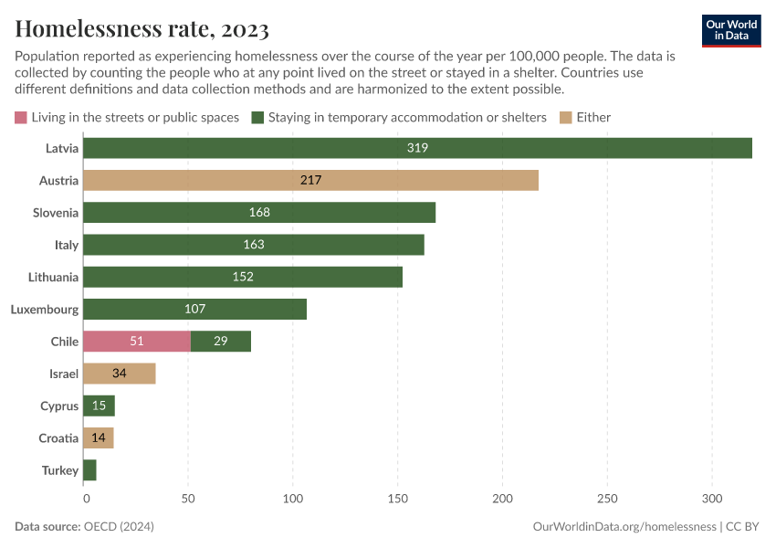 Bastian Herre and Pablo Arriagada (2024) - “Homelessness” Published online at OurWorldinData.org. Retrieved from: 'https://categorical-map-color.owid.pages.dev/homelessness' [Online Resource]BibTeX citation