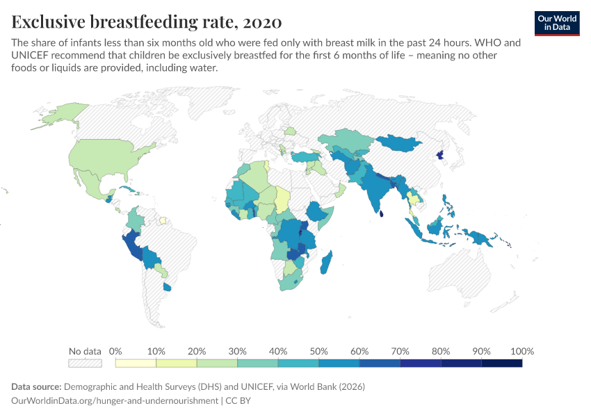 As the map shows, the number of infants who are exclusively breastfed is still low in many countries.40