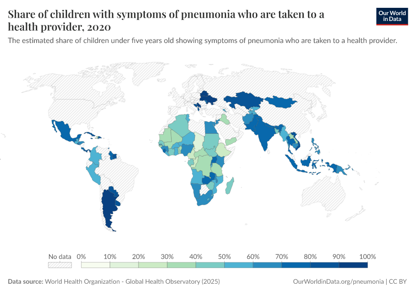 As the map shows, the share of children with symptoms of pneumonia that are taken to a health provider is still low in many countries.