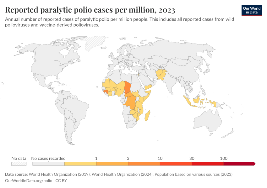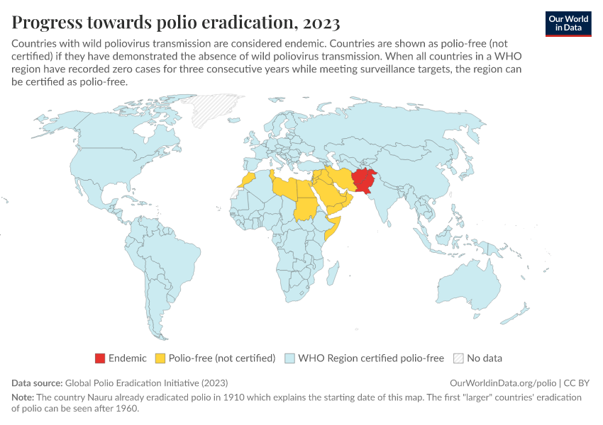 Saloni Dattani, Fiona Spooner, Sophie Ochmann, and Max Roser (2022) - “Polio” Published online at OurWorldinData.org. Retrieved from: 'https://categorical-map-color.owid.pages.dev/polio' [Online Resource]BibTeX citation