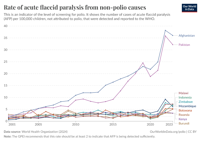 This rate is measured per 100,000 children. The higher the rate, the more likely that potential cases of polio are being identified. The GPEI recommends that this rate should be at least 2.