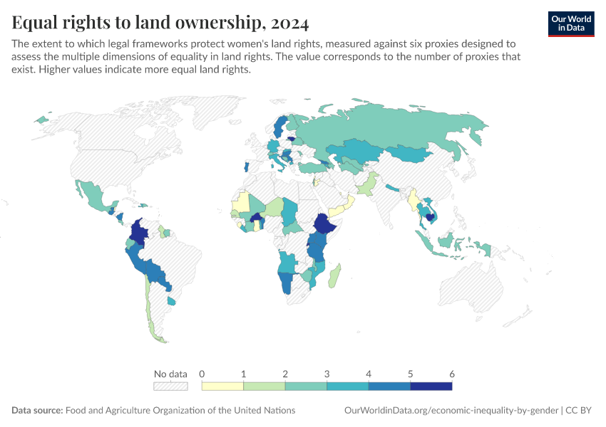 This is measured on the basis of whether a given country's legal framework guarantees women's equal rights to land ownership. Data for this indicator is shown in the first chart in the interactive visualizations, along with a related measure for land ownership differences between men and women (second chart).