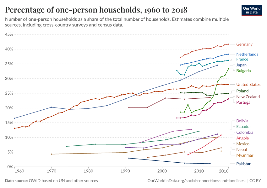 In the US, the share of adults who live alone nearly doubled over the last 50 years. This is not only happening in the US: single-person households have become increasingly common in many countries across the world, from Angola to Japan.