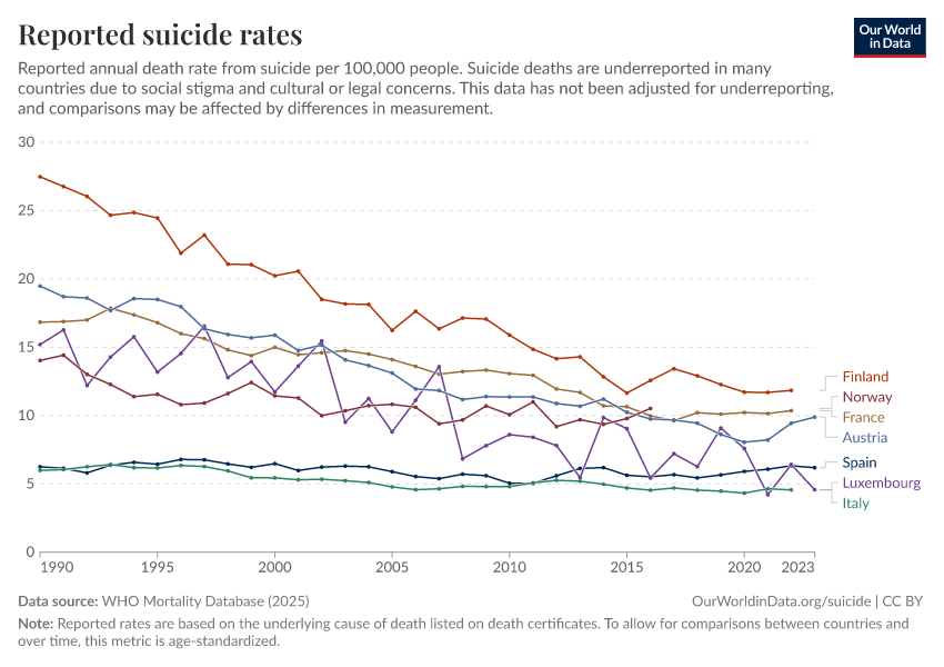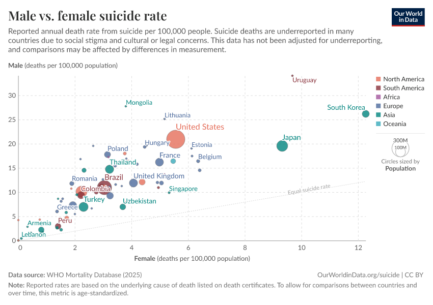 Saloni Dattani, Lucas Rodés-Guirao, Hannah Ritchie, Max Roser, and Esteban Ortiz-Ospina (2023) - “Suicides” Published online at OurWorldinData.org. Retrieved from: 'https://categorical-map-color.owid.pages.dev/suicide' [Online Resource]BibTeX citation