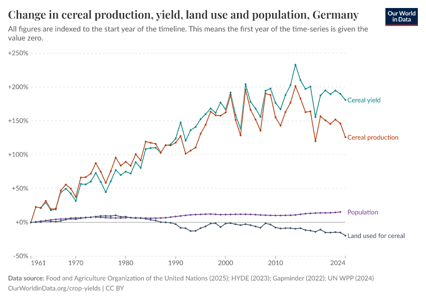 Here we use Germany as a representative of a high income country with a stable population size—in this regard, its trends are similar to many countries across Europe. Below we see that despite a roughly constant population size, Germany’s cereal output has continued to increase. Like the United States, the total land used for cereal production has marginally declined over this period. Increases in cereal output have therefore been achieved through yield improvements alone.