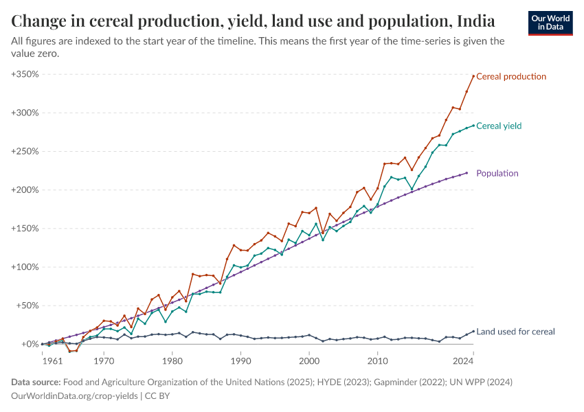In the chart below we have mapped four variables: total cereal production; average cereal yield; land area used for cereal production; and total population. These are measured as an index relative to their respective values in 1961 (i.e. 1961 is equal to 0).