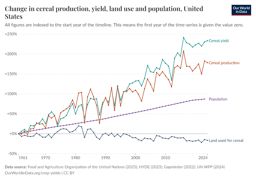 Since 1961, the US’s population has been growing modestly. Cereal production grown much faster. Overall, we see that land allocated to cereal production in the United States has actually declined slightly.